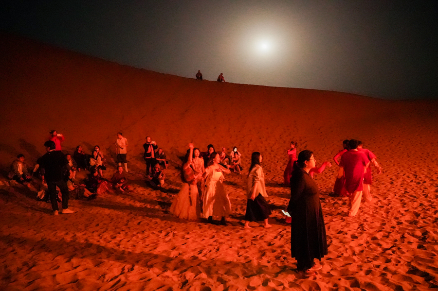 塔克拉玛干沙漠的午夜,0时42分,烟花像一列金色列车,在满天星河中轰然驶过。篝火旁,古老的十二木卡姆乐章仍在低吟,纵横中文网编辑可可动情地说道:“这一刻,沙漠带给我的感动无以复加。”而白日里娴静的作家乐希,以让伙伴们“感到陌生”的“疯狂”,在漆黑的夜色中光着脚丫恣意在沙丘脊线上狂奔。