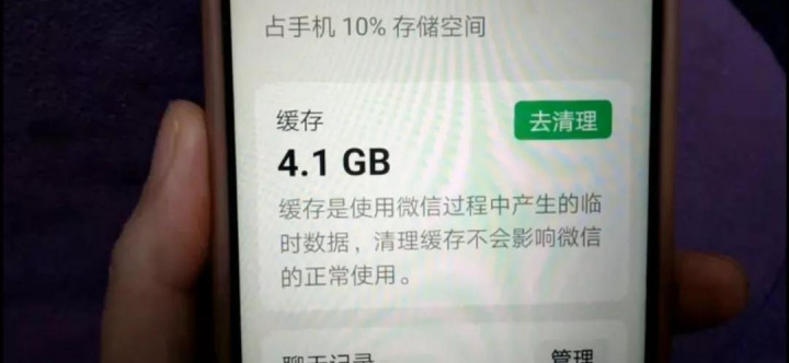 我们赶快把这个深度清理来打开,立刻微信就计算出内存空间了,占了手机10%的内存空间,是不是太离谱了呢?大家赶快来清理这些缓存垃圾了,看下方这里有一个缓存占了4.1 GB,我们点开后方的“去清理”。