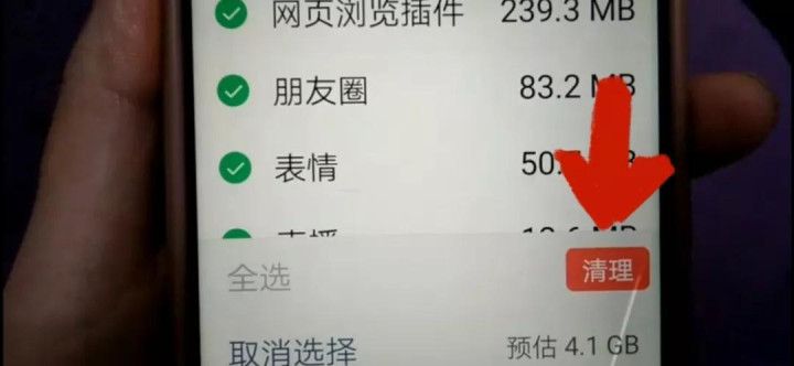 那么在这里就可以看到,这就是我们平常看的视频号、公众号,打开的小程序、朋友圈、表情之类的占用的空间了,我们点下方的“清理”,立马就把它立刻清理了,就能腾出4个G的空间了,是不是太棒了?